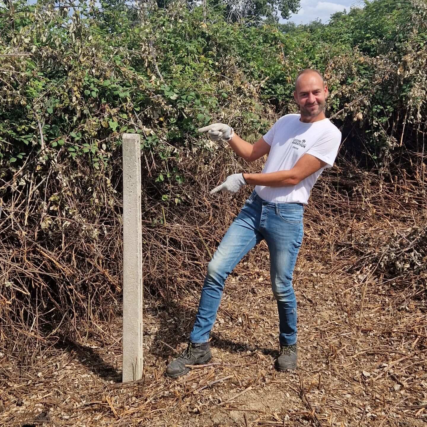Een andere, net zo omvangrijke klus was het opzoeken van de grenspaal. Die paal stond ergens verstopt in zestien jaar wildgroei aan bramen. Toch was het belangrijk om die grenspaal te vinden, omdat we het vermoeden hadden dat de boer van het terrein naast ons bij het inzaaien steeds een klein stukje van ons land meesnoepte. Waarschijnlijk wist 'ie ook niet meer precies waar de grens liep, omdat hij jarenlang het hele terrein heeft mogen gebruiken. Hoe dan ook: de grenspaal is een duidelijke markering voor iedereen, dus gingen we gewapend met een bosmaaier op zoek in de bramenwoestenij. Uiteindelijk, na een paar dagen maaien, hadden we niet alleen de grenspaal gevonden, maar ook zo'n 20 meter van ons eigen terrein teruggewonnen. De boer is laatst weer langsgeweest om z'n akker in te zaaien en heeft zich nu keurig aan de grensmarkering gehouden.