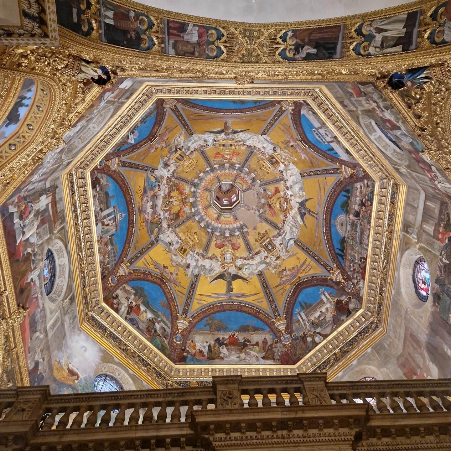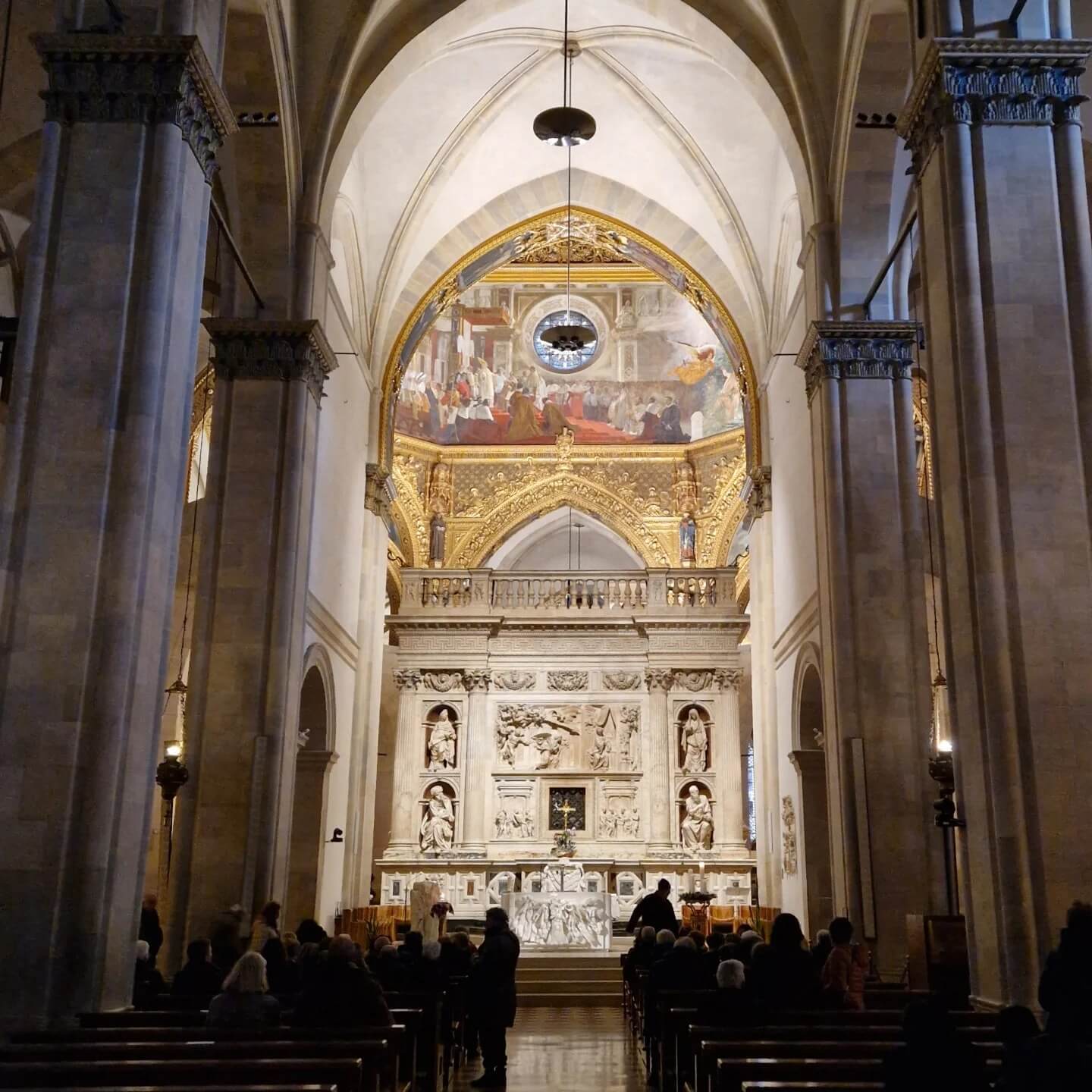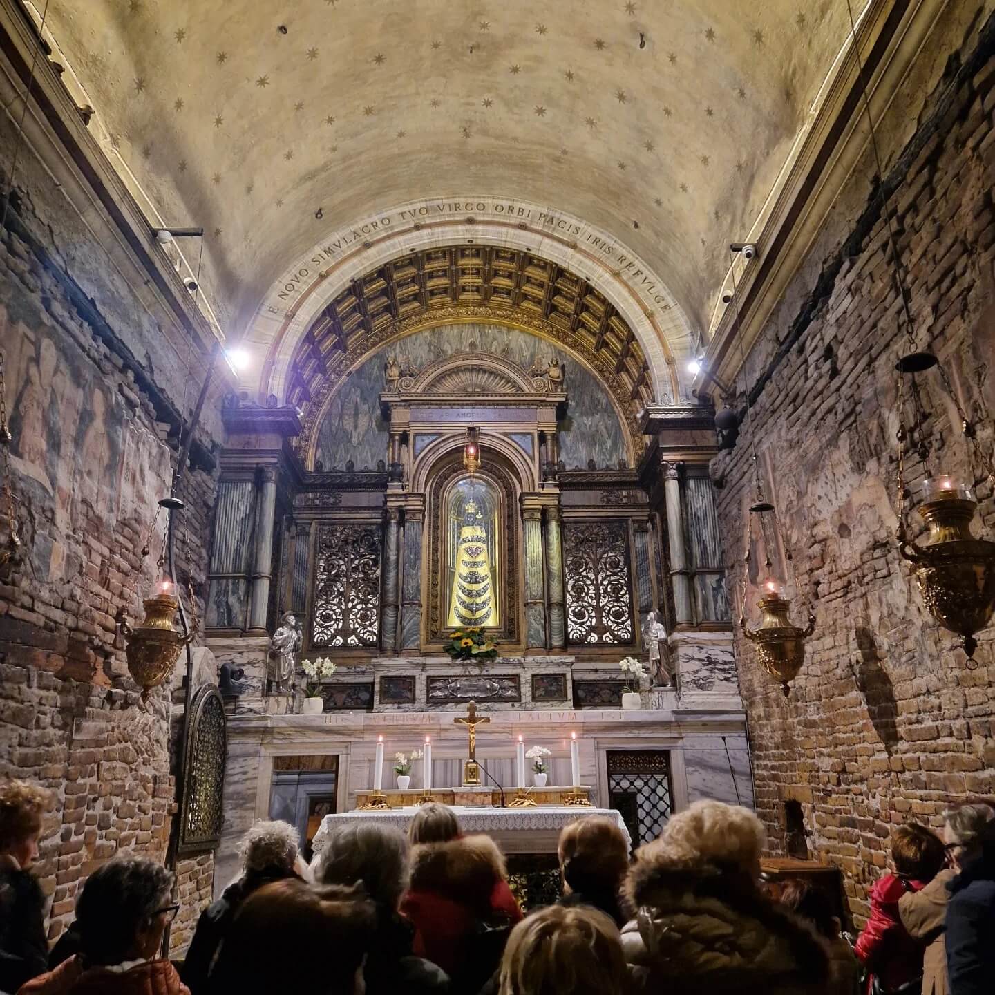 In Loreto hadden we voor aanvang van de mis nog even tijd om de basiliek te bewonderen. Het huis van Maria stond natuurlijk volop in de aandacht. Het bakstenen gebouwtje staat midden in de kerk, beschermd door een groter, rijkelijk versierd marmeren omhulsel. Recht erboven bevindt zich de imposante koepel van de basiliek. Binnen drongen mensen samen om op hun knieën te vallen en de zwarte Madonna van Loreto te aanbidden. Voor ons als nuchtere Hollanders best een ongebruikelijke aanblik. Veel mensen hier nemen de legende anno 2024 uitermate serieus. Wat voor ons niet meer dan een mooi verhaal en een interessante geschiedenis is, is voor menig Italiaan de letterlijke waarheid. Ter herinnering aan het bijzondere luchttransport schijnen jaarlijks door heel Le Marche zelfs nog talloze vuren te worden ontstoken, om zo een soort landingsbaan voor engelen te creëren... Hoe dan ook, het was indrukwekkend om een mis mee te maken in deze enorme basiliek, die zo vol zat dat er mensen in de gangpaden moesten blijven staan. Al met al weer een mooie ervaring.