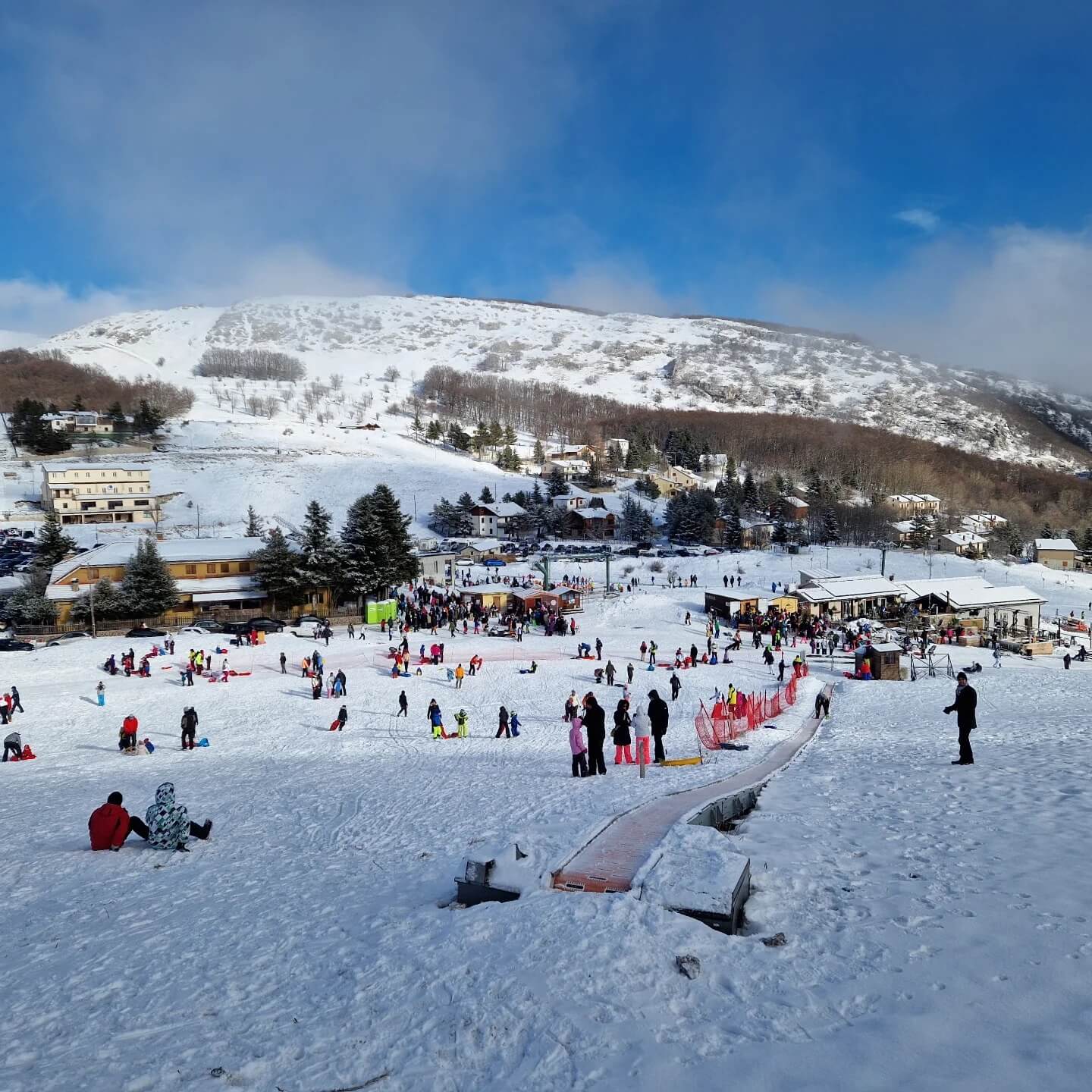 Om ons nog meer echte Italianen te voelen, hebben we vorig weekend ook nog gedeeld in de sneeuwpret. Op een goed uur rijden van ons huis bevinden zich de Sibillinibergen, een stuk van de Apennijnen waar nu een hele hoop sneeuw te vinden is. Vanaf het terras van ons huis kun je deze bergen al zien liggen. Ze zijn normaal al mooi om te zien, maar sinds er sneeuw op ligt, is het helemáál een plaatje. We wilden dit tafereel al langer eens van dichtbij bekijken en namen de uitnodiging om mee te gaan sleeën dan ook graag aan.