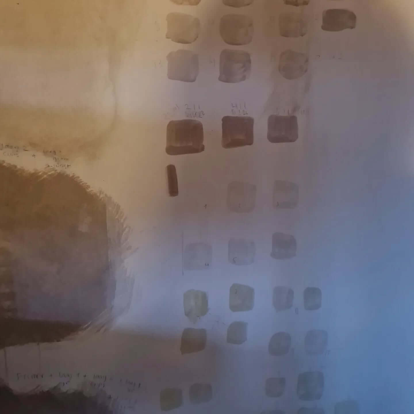 Nou, een uitdaging werd het. Esther heeft dagenlang testbatches gemaakt met tientallen verschillende recepten en honderd verschillende kleurencombinaties. Muren in ons huis die toch nog moeten worden behangen, werden als testlocatie gebruikt. We leerden meer dan we ooit hadden gedacht (en gewild) over kalkverf. Bijvoorbeeld dat de kleur in je bakje niks zegt over hoe de kleur op de muur overkomt en dat die kleur na twee dagen weer totaal anders kan zijn. Dat het uitmaakt op welke manier en met welke kwast je de kalk op de muur smeert én dat kalk een enorm venijnig, uitdrogend goedje is dat je hele handen kapotmaakt, zelfs door handschoenen heen. Toen we na eindeloos proberen het recept en de kleur eindelijk helemaal naar ons zin hadden, gingen we 'voor het echie' in het tuinhuis aan de slag, waar de kleur wéér heel anders werd dan verwacht, omdat (denken we) de ondergrond verschilde en dus anders reageerde dan de testlocatie. Wat een gedoe! Dagenlang is Esther aan het finetunen geweest om de kleur weer goed te krijgen. Heel eerlijk heeft ze er minstens drie keer aan gedacht om de handdoek in de ring te gooien en gewoon een pot verf te gaan halen bij de bouwmarkt. Aan het eind zat er echter al zoveel tijd in dat het moest en zou lukken. Hollandse trots stond haar in de weg. En het lukte! Ontzettend veel tijd, frustratie en tien zeer pijnlijke kapotte vingers later, hebben we eindelijk de gekalkverfde muren waar we op hoopten. Was het het waard? Dat weten we nog niet. Even zien hoe de muren er over een half jaar uitzien. Maar het resultaat is voor nu in ieder geval mooi. Het charmante aan kalkverf is dat de lichtval bepaalt welke kleur je ziet. De kleuren op de muur variëren nu van zacht geel naar beige en wit. Een bijzondere combinatie die mooi bij onze nieuwe vloer past. Op de foto's kun je goed zien hoe donker de verf in eerste instantie oogt als je het op de muur smeert en hoe licht het daarna opdroogt. Het was echt een gevalletje trust the process.